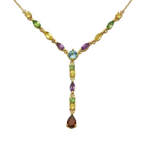 Add a rainbow of color to your neckline with this beautiful multi-gemstone Y-necklace, fashioned in shiny gold-dipped sterling silver. A faceted round of sky blue topaz marks the center, and a pear-shaped drop of orangey-red garnet tips the end. Also in the mix are purple amethysts, spring green peridots, and golden citrines, in round and marquise shapes. The 17-inch necklace is completed with a slender cable chain and spring ring clasp. Show it off with an open V neckline or a strapless style.