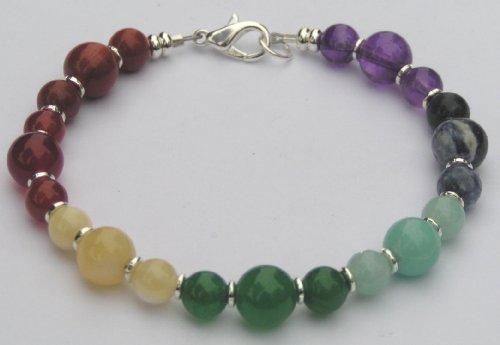 Stimulate the balancing of your chakras by using our Heart Projects ChakraMid® Chakra Bracelet. There are seven major Chakras (energy centers) in our bodies and each gemstone bead (6mm & 8mm) in this bracelet corresponds with one of the Chakras as noted below. This bracelet measures approximately 7 3/4 inches in length.Gemstone Meanings(From left to right on bracelet)1st Chakra: Red Jasper - Red Jasper is thought to stimulate the base Chakra (the 1st Chakra) and to promote grounding, stability and protection. 2nd Chakra: Carnelian - Carnelian is said to powerfully enhance creativity and to protect one from anger, jealousy and fear. It can also stimulate pleasure and gratitude for the physical world.3rd Chakra: Yellow "Jade" - Actually a Jasper, this is a "Power" stone that promotes perseverance and tenacity. It helps to generate determination and courage in all you do.4th Chakra: Green Aventurine - Green Aventurine is associated with the Heart Chakra (the 4th Chakra). Used around the heart, it clears negative emotions and protects this Chakra, while gently bringing about a sense of calm, balance and happiness.5th Chakra: Amazonite - Amazonite is believed to a stone of truth, communication and integrity. It is thought to lessen stress and to be effective in facilitating self-expression and public speaking. It also enhances intuitive insight and creativity.6th Chakra: Sodalite - By uniting logic and intuition, Sodalite aids in aligning your Higher Mind with your daily activities. It is great for groups, speakers and teachers, as it instills harmony, trust and solidarity of purpose.7th Chakra: Amethyst - Thought to activate the right brain, Amethyst is said to help develop psychic abilities, increasing insight, and assisting in uplifting one to a higher spiritual level.If you need a small (7 inch) or large (8 1/2 inch) contact us immediately after purchasing